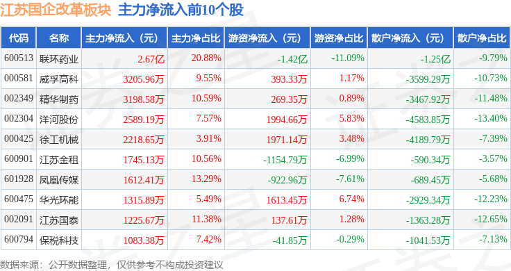 从资金流向上来看,当日江苏国企改革板块主力资金净流入7770.41万元,游资资金净流出1.19亿元,散户资金净流入4124.94万元。江苏国企改革板块个股资金流向见下表: