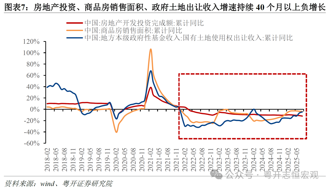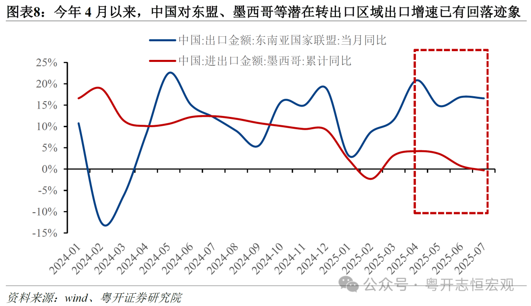反内卷时期,房地产处于深度调整的下行周期,且关税战对出口的不利影响可能逐步显现,需求不足问题更为突出。内需方面,当前人口总量减少以及房地产供需形势逆转,房地产处于深度调整的下行周期,导致投资、销售、土地市场持续低迷。2025年1-7月,房地产投资、商品房销售面积、政府土地出让收入分别同比下降12.0%、4.0%和4.6%,均连续40个月以上负增长。房地产市场持续低迷不仅直接拖累总需求,还会通过土地出让收入下降间接掣肘财政支出,通过财富缩水限制居民消费潜力。外需方面,关税战对出口的不利影响可能逐步显现,上半年为应对关税不确定性而出现的“抢出口”和“转出口”效应可能会减弱。一方面,虽然当前我国出口仍然具有韧性(2025年7月出口同比增长7.2%),但美对华实际关税税率仍高达40%,未来“抢出口”效应将逐步消退。另一方面,美国试图对中国转出口地区加征高关税,围堵中国企业转出口。目前,美国对东盟、墨西哥等中国潜在转出口地区征收的关税普遍高于日、韩、欧盟等区域,今年4月以来,中国对东盟、墨西哥的出口增速已出现回落迹象。