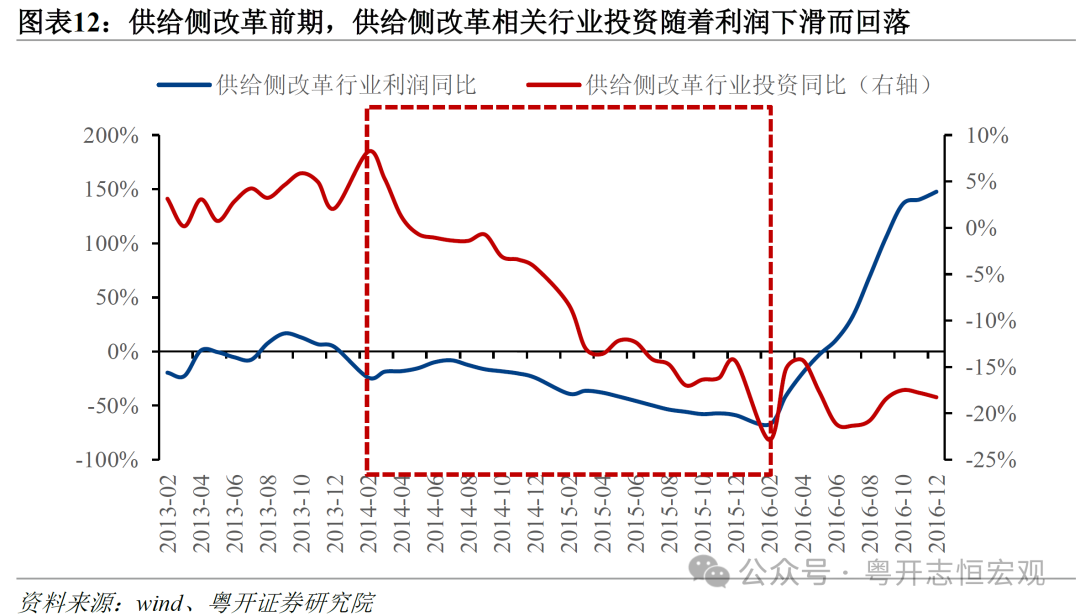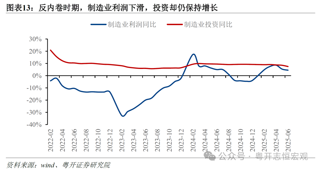 正是由于原因不同,面对需求下行时,供给侧改革时期企业投资随盈利恶化而回落,产能随之收缩;而反内卷更多发生在技术更新迭代迅速、技术路线和行业格局尚未定型的新兴领域,企业一旦停止投入就可能彻底失技术优势和市场份额,因此企业即便短期亏损,也必须持续投入以争取未来生存空间,形成了“越亏越投”的独特困境。供给侧改革前期,供给侧改革行业工业利润增速由2014年初的-24.1%下滑至2015年末的-58.9%,制造业投资增速从2014年初的8.2%跟随式下滑至2015年末的-14.4%。而本轮反内卷时期,制造业工业利润增速自2022年以来多数处于负值区间,但制造业投资却保持在10%左右的较高增速。
