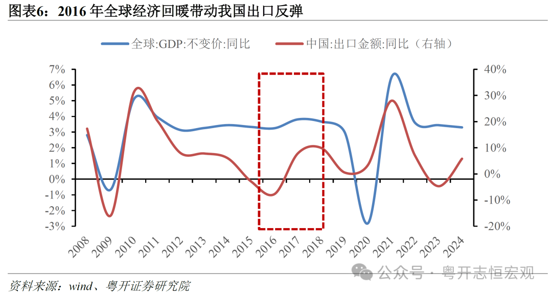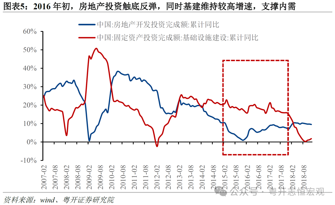 供给侧改革时期,房地产经历去库存后进入上行周期,且全球经济回暖带动出口回升,需求仍有韧性。内需方面,2008年国际金融危机后,“四万亿”刺激计划提振了经济,但是随着“四万亿”等宏观刺激政策逐渐退坡,需求趋于回落,房地产进入去库存周期。2015年之后,随着棚改货币化安置等政策实施,房地产库存去化加快。2016年初房地产投资触底反弹,房地产市场进入上行周期。同时,基建投资维持了约15%-20%的较高增速,与房地产共同对内需形成有效支撑。外需方面,随着2008年国际金融危机和2012年欧债危机的冲击逐步消退,2016年全球经济开始复苏,外需回暖带动中国出口增速大幅反弹,2017年我国出口同比增长7.9%,增速比上年提高15.6个百分点。