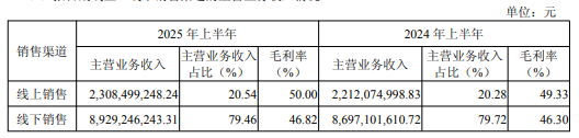 渠道优化已初见成效。尽管主品牌营收同比下降5.86%,但公司整体营收仍实现1.73%的增长,达到115.66亿元。线上渠道表现尤为亮眼,23.08亿元的收入毛利率较去年同期提升0.67%,稳住50%,占总营收比重提升至20.5%。