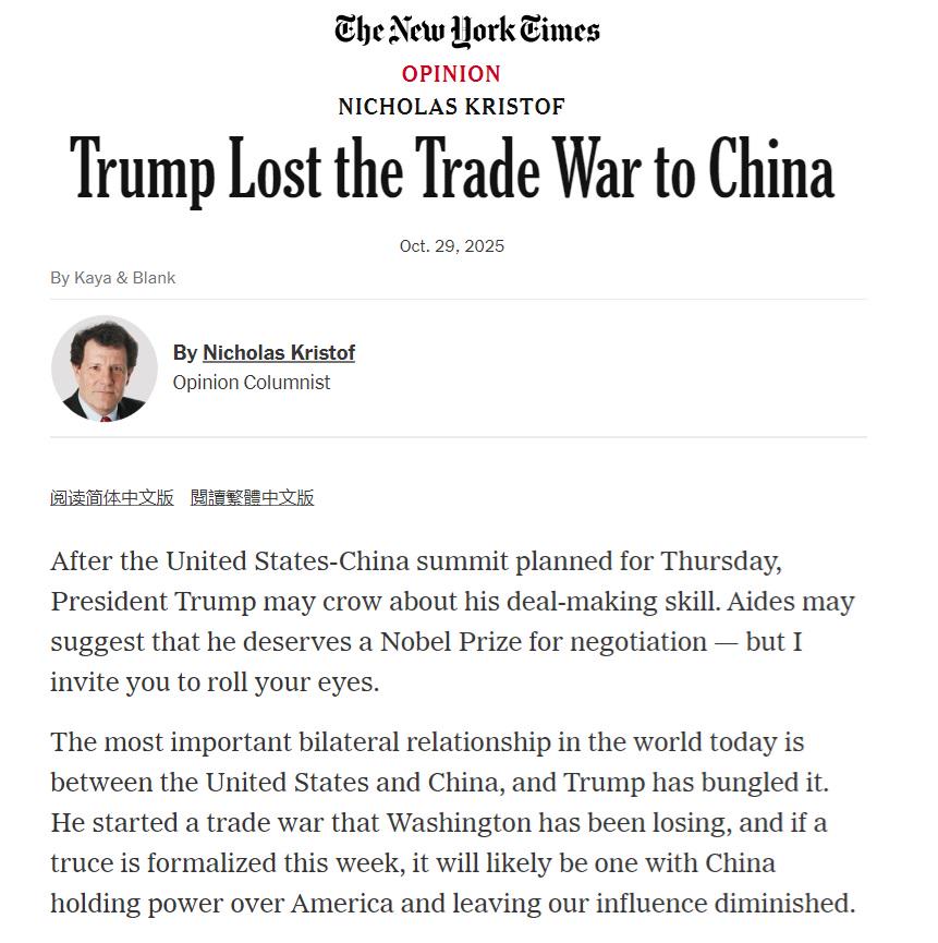 克鲁格曼开场就立刻指出,从10月30日中美釜山共识来看,美国“已经输了”这场贸易战!他认为这不是“正在输”,而是“中美贸易战已经结束,结果是美国输了”!