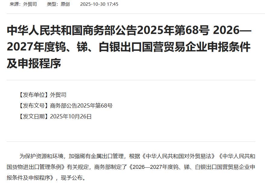 10月30日,中国商务部公开了《2026—2027年度钨、锑、白银出口国营贸易企业申报条件及申报程序》,各位看到了吗?这就是不按套路出牌,10月9日的的0.1%稀土管制措施暂停一年,但是没说钨、锑、白银这些关键元素的出口不能管制啊!