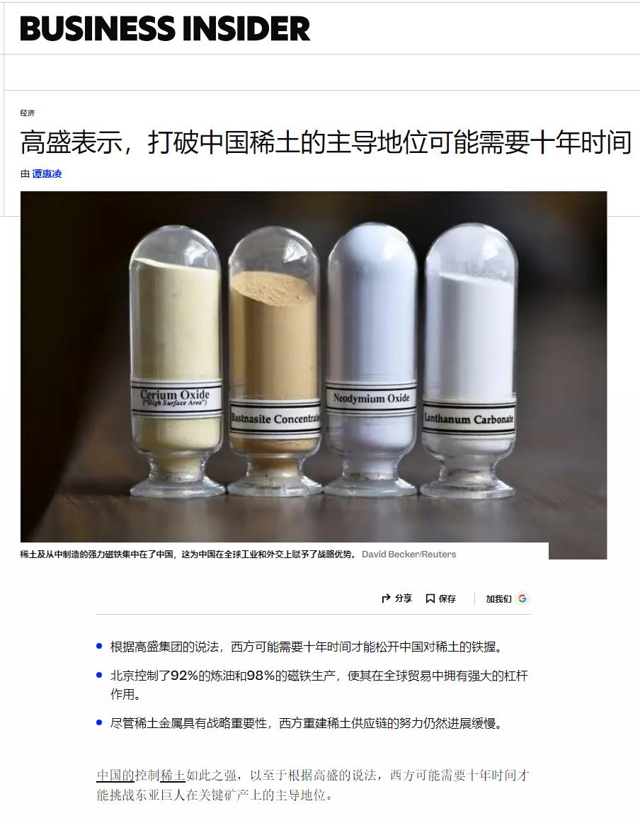 商业内幕在10月29日发表了高盛对美国以及西方稀土产业的评估报告,根据高盛集团的说法,西方可能需要十年时间才能和中国稀土产业对抗,目前中国控制了92%的稀土精炼和98%的稀土磁铁生产,这是其在全球贸易中拥有强大的杠,美国如果以关税战对付中国,那么在稀土围剿下美国将毫无应对之策。